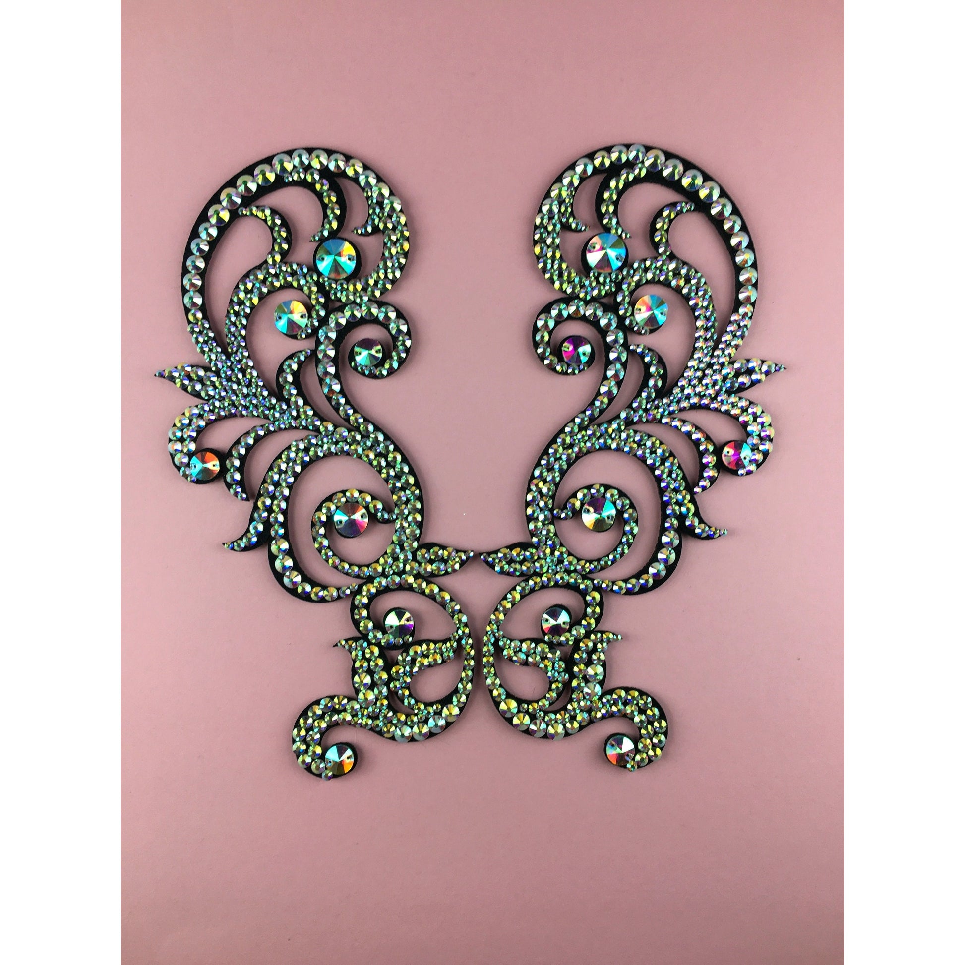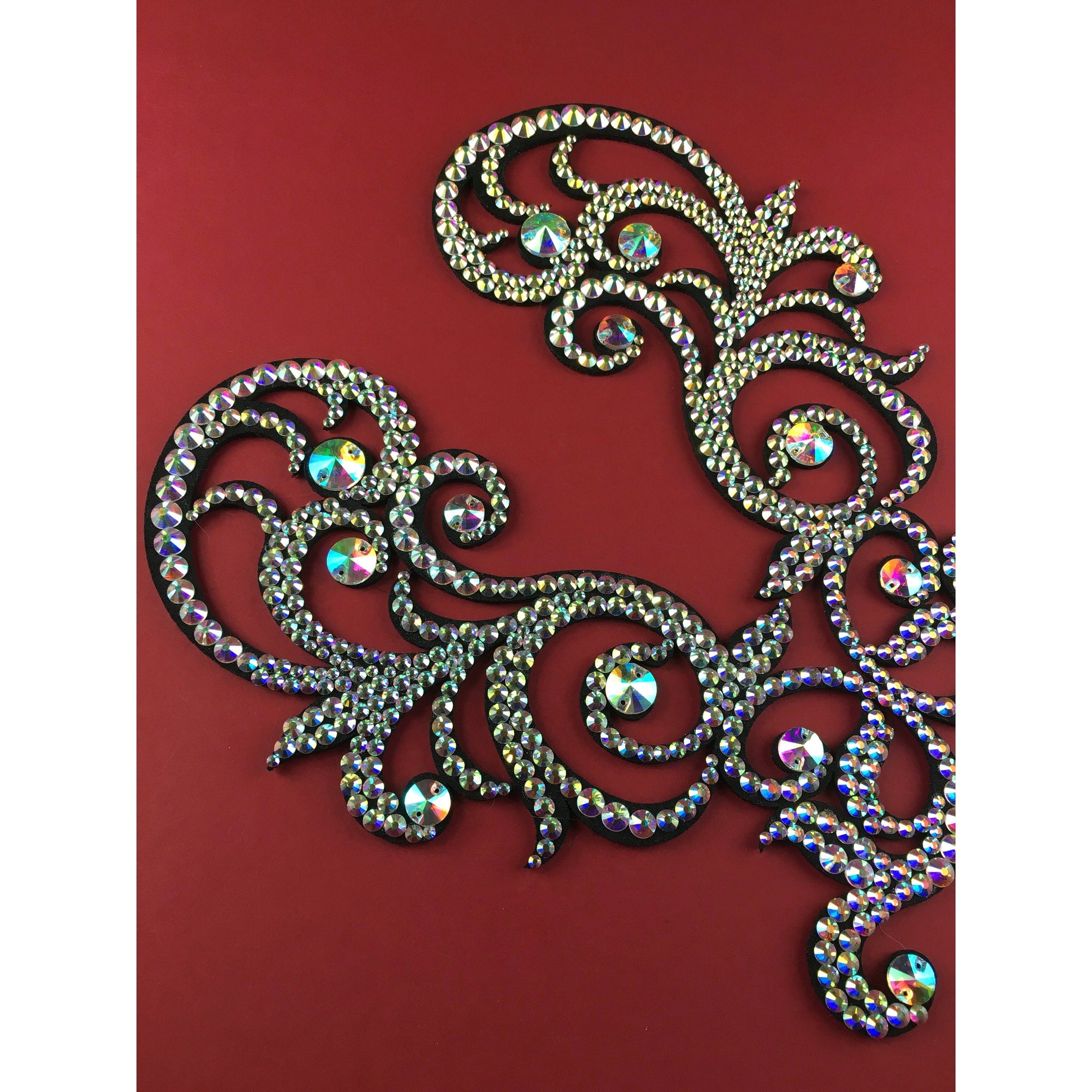 Bring your costume to life with this luxurious rhinestone applique, laser-cut from durable 1.2 mm felt and hand-decorated with sparkling crystals. Perfect for bellydance, latin dance, ballroom or gymnastics outfits.