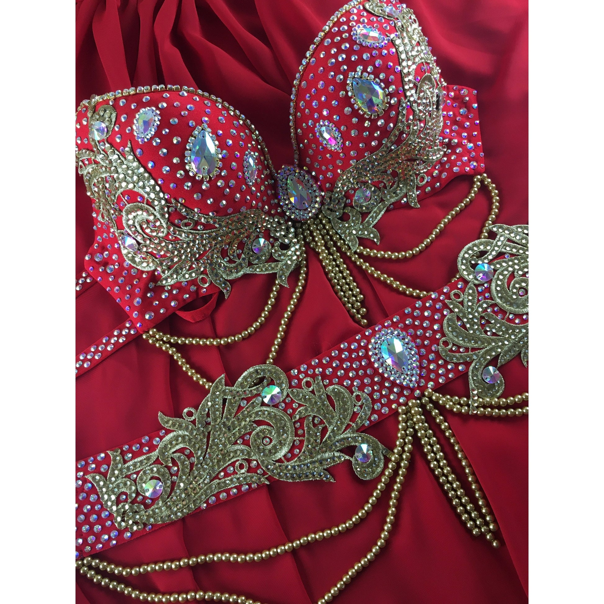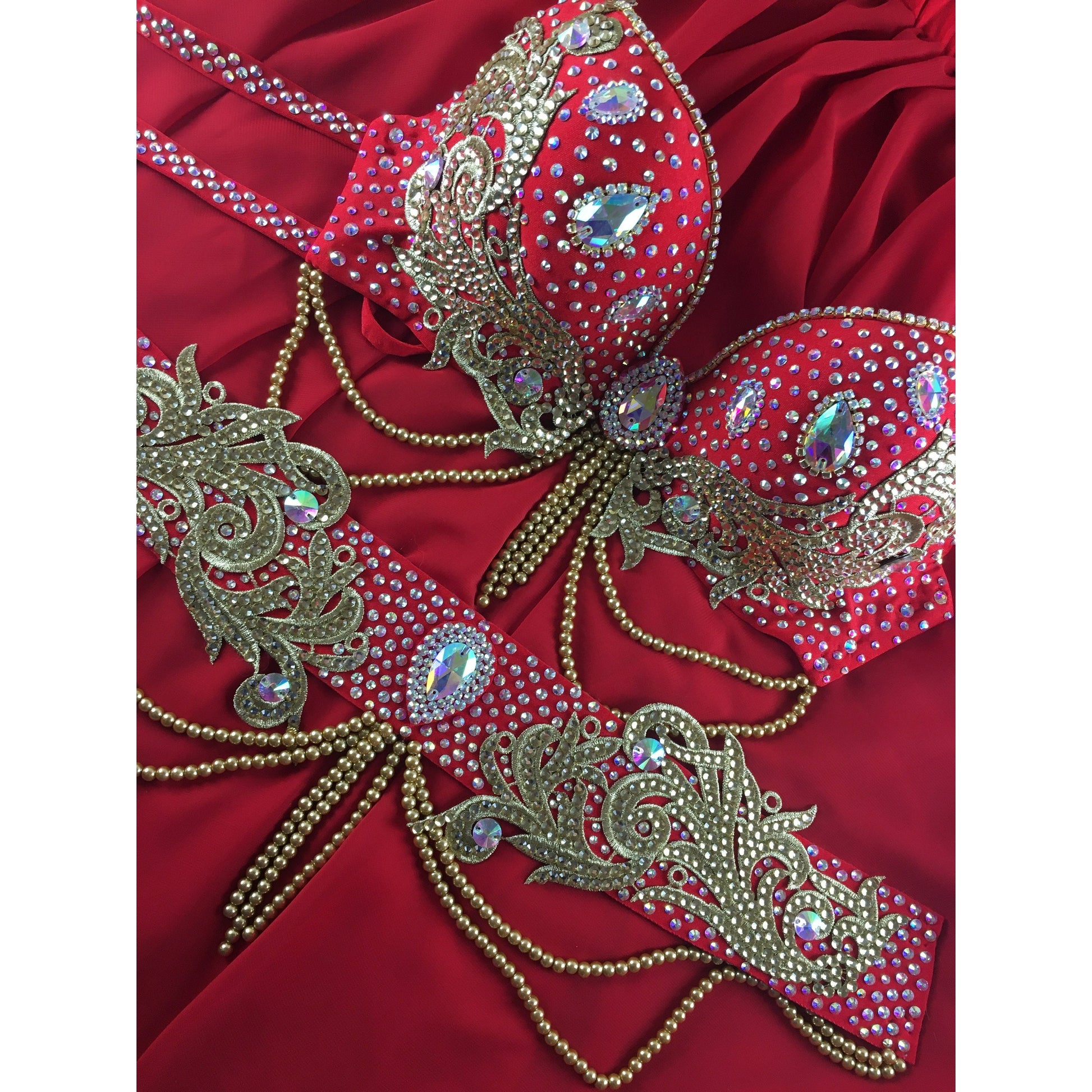 Turn every performance into a show-stopping moment with this luxurious red belly dance costume. The richly embellished bra and belt feature rhinestones, golden appliqués, and an exquisite gold pearl drape that adds movement and elegance. The look is completed with a flowing chiffon circle skirt.